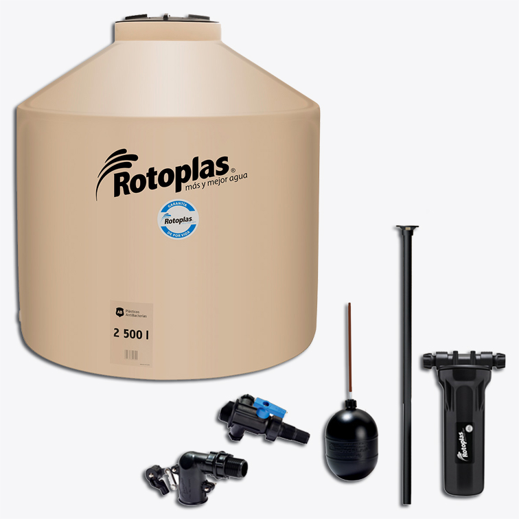 CARACTERÍSTICAS: Ideal para 15 personas. Cuenta con una exclusiva capa antibacterial con tecnología expel que inhibe la producción de bacterias manteniendo el agua más limpia. Su tapa click con cierre perfecto evita que entren contaminantes al agua. Equipada con accesorios rotoplas con garantía de 5 años y cero fugas. Incluye: 1. Válvula de llenado. 2. Multiconector con válvula esfera y tuerca unión. 3. Flotador 5. 4. Jarro de aire. 5. Filtro estándar.