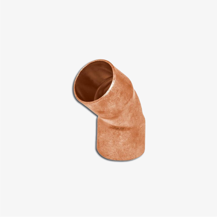 BENEFICIOS: Permitir un cambio en la dirección del fluido. CARACTERÍSTICAS: ° 1 X 45º. ° Material: Cobre Cu 99.9999%. ° Tipo de conexión: Codo. ° Aplicación: Conducción de gas L.P. y natural / Agua / Aire / Vapor / Vacío. ° Presión de trabajo: 34.16 kgf/cm² (485 psi).
