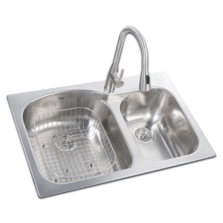 CARACTERÍSTICAS: Tarja: °Acero inoxidable. °Acabado: Pulido. °Instalación: Dual mount(Empotrar/Submontar). °Desagüe: 3 1/2’’. °1 Agujero para grifería. °Calibre: 19. Monomando: °Acabado: tipo acero inoxidable. °Caño giratorio. °Aireador anti-cal. °Maneral extraíble con 2 funciones: Regadera y chorro. °Mangueras flexibles de alimentación incluidas. °Cartucho cerámico de gran duración. °Presión de funcionamiento recomendado: 2 – 5 bar (bar/cm ). -Accesorios: Canastilla para cubeta, Escurridor de platos y ContracanastasTKM(X2).