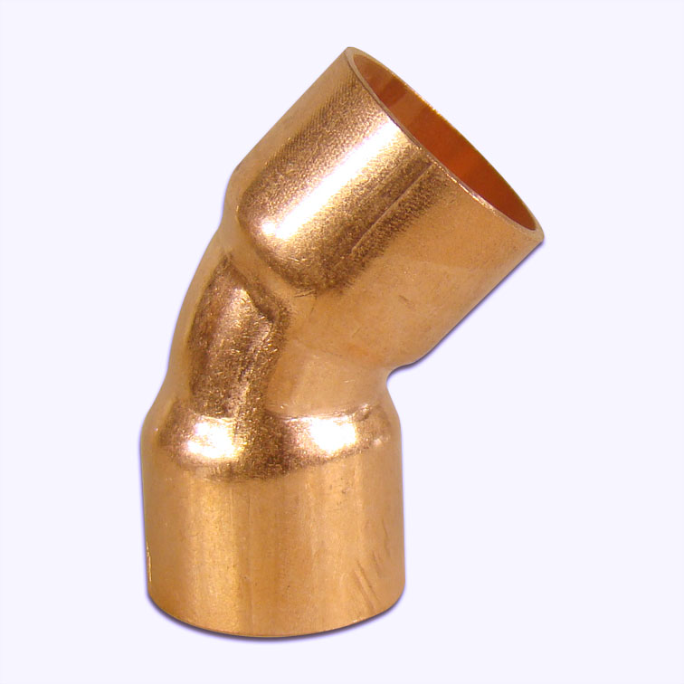BENEFICIOS: Permitir un cambio en la dirección del fluido. CARACTERÍSTICAS: ° 1/2 X 45º. ° Material: Cobre Cu 99.9999%. ° Tipo de conexión: Codo. ° Aplicación: Conducción de gas L.P. y natural / Agua / Aire / Vapor / Vacío. ° Presión de trabajo: 34.16 kgf/cm² (485 psi).