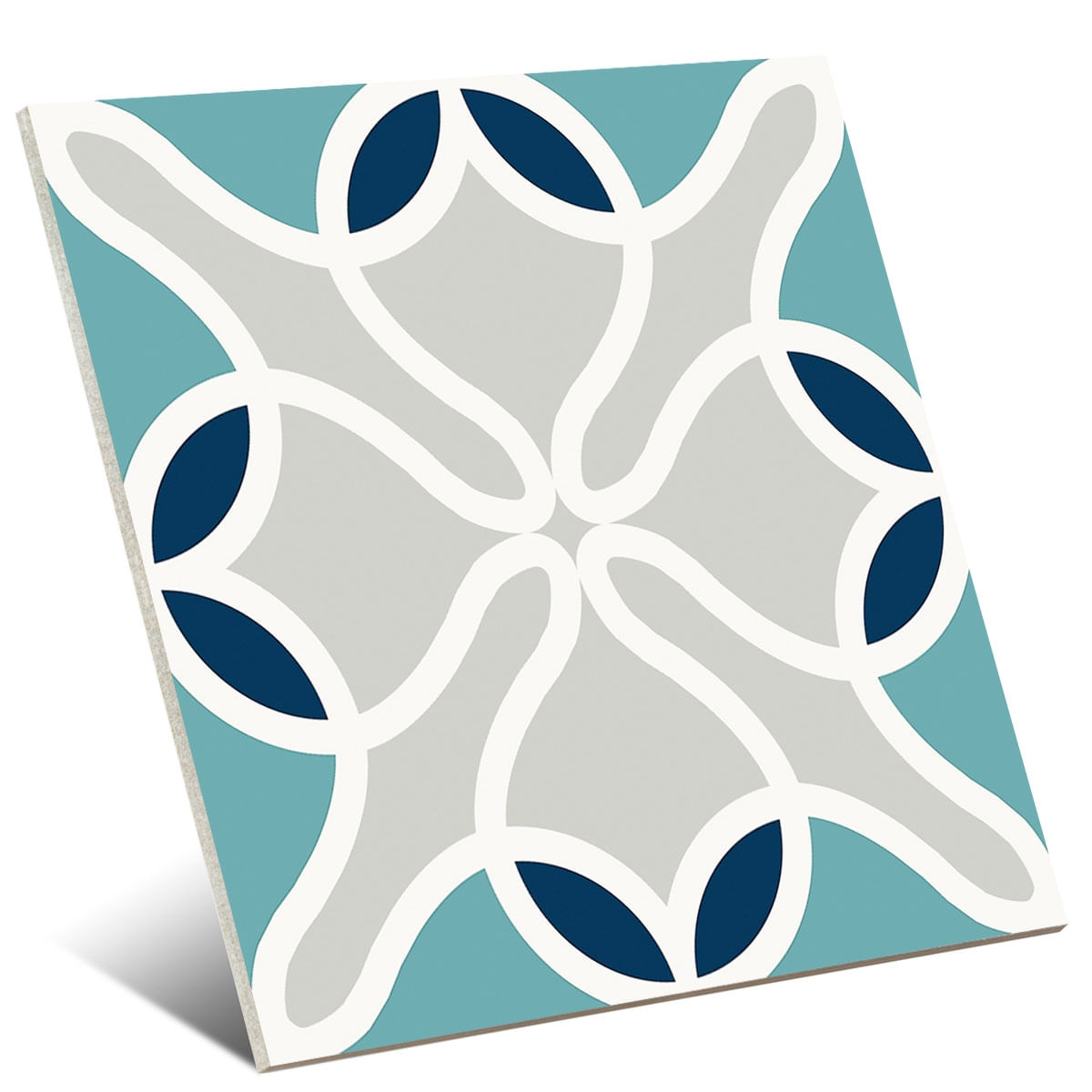 CARACTERÍSTICAS: Azulejo de inspiración hidráulica, en 20x20 cm, con un estampado de aire clásico pero renovado en tonalidades aguamarina, azul marino, gris y blanco, 14 piezas por caja, 0.56 MT2.