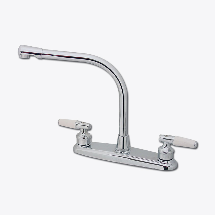CARACTERÍSTICAS: Mezcladora 8 al piso para fregadero con cubierta, Acabado: Cromo, Nariz tubo de latón, Dispositivo de ssalida aereador, Cubierta latón, Cuerpos laterales de bronce fundido con tubo de latón, Cierre a 90°, Cartucho ceramico, Manerales piruli blanco, Alimentación 1/2 (13mm) NPS. PRODUCTO ECOLÓGICO.