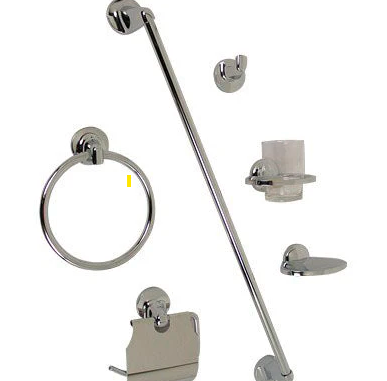 CARACTERÍSTICAS: Juego de accesorios p/baño, Acabado Cromo-Dorado. Contiene: 1 Jabonera Metálica. 1 Portacepillos Metálico. 1 Gancho Metálico. 1 Porta rollo metálico. 1 Toallero de barra latón. 1 Toallero de argolla latón.